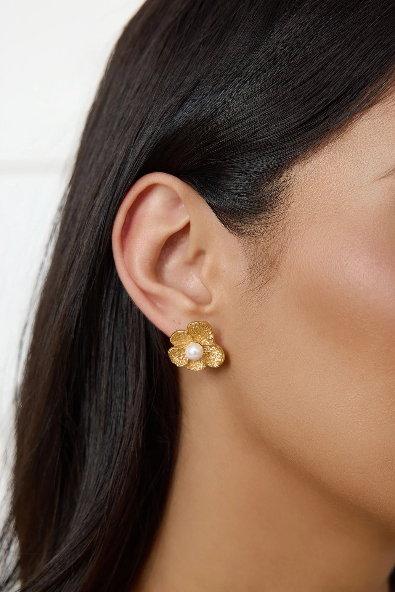 Delicate yet dazzling, the 18k Gold Plated Match My Level Earrings are the perfect touch of elegance. Featuring a chic flower design with a faux pearl centre, these 18k gold-plated beauties add timeless charm to any outfit.