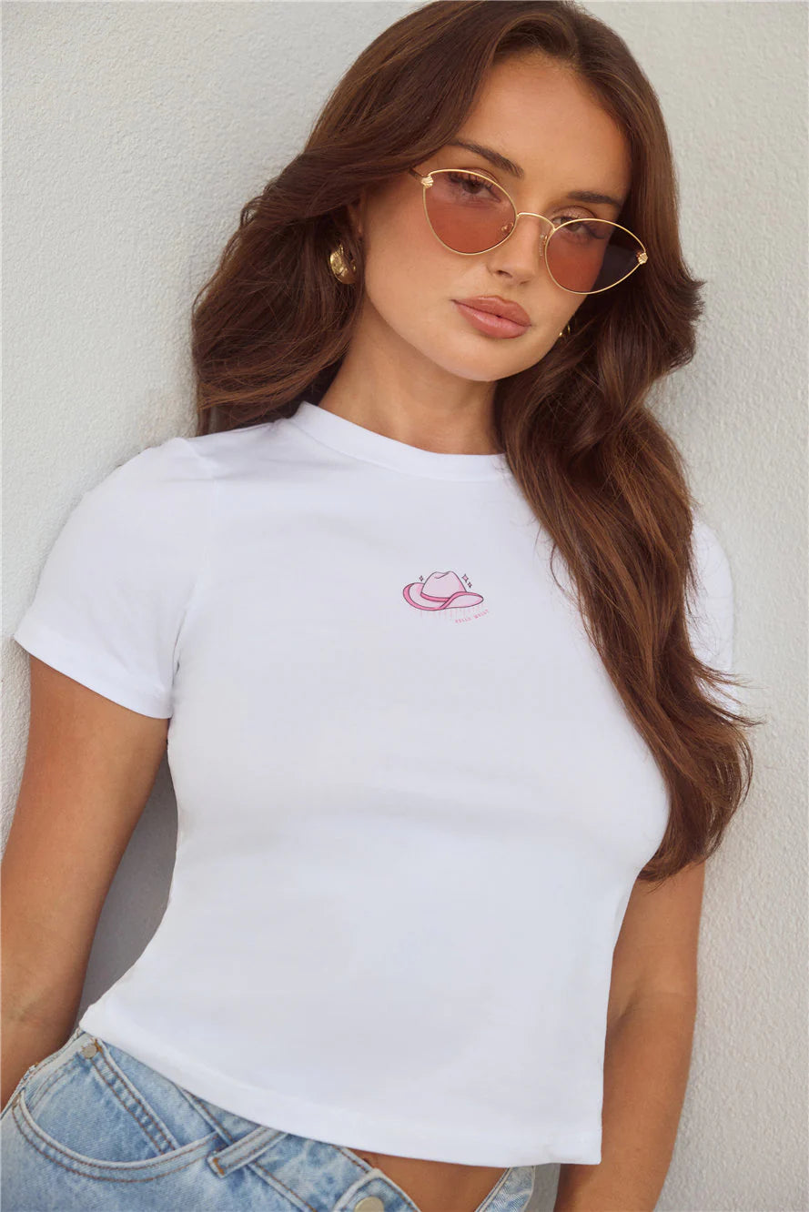 The BASE Wild West Baby Tee is your new go-to for cute and comfy days. Made from soft, stretchy fabric and finished with a playful graphic cowboy hat print, this tee slips on effortlessly for a look that’s casual with a flirty twist.