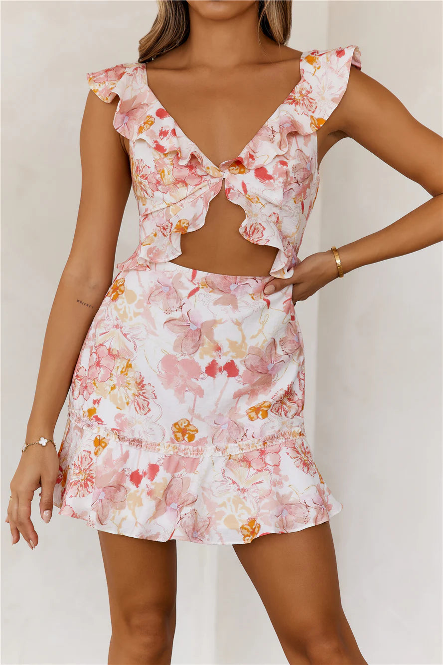 Isn't she lovely? We're in love with this dreamy design for the warmer weather. The Blooming Summer Mini Dress features frill details, a cutout to the bodice and a tie-up back. Style with sandals, beachy waves, and all your confidence!