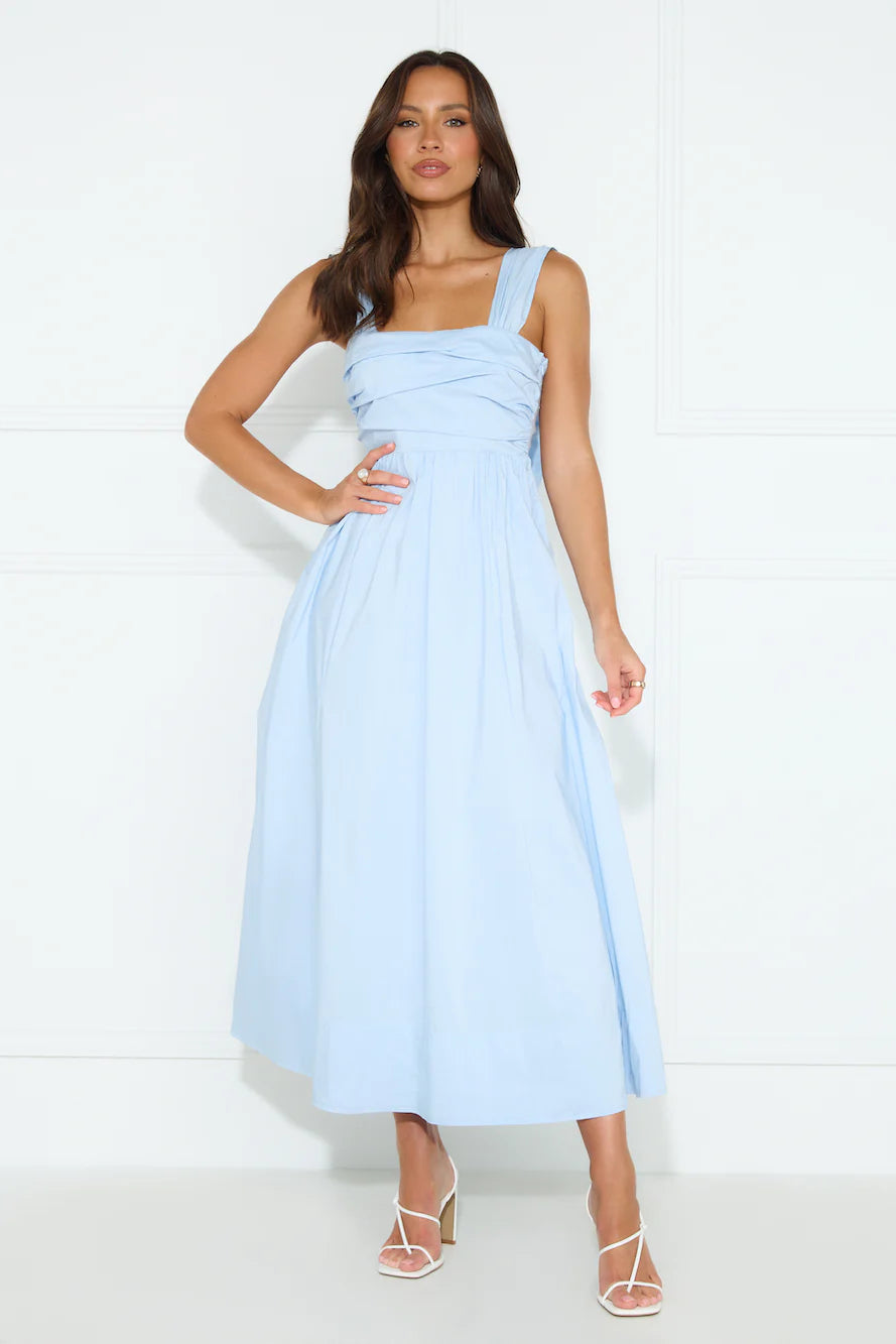 Enter your soft girl era with the Bluebell Blossom Midi Dress. Featuring a pleated top, a flowy skirt and a tie-up back. Style with heels for a dreamy 'fit.