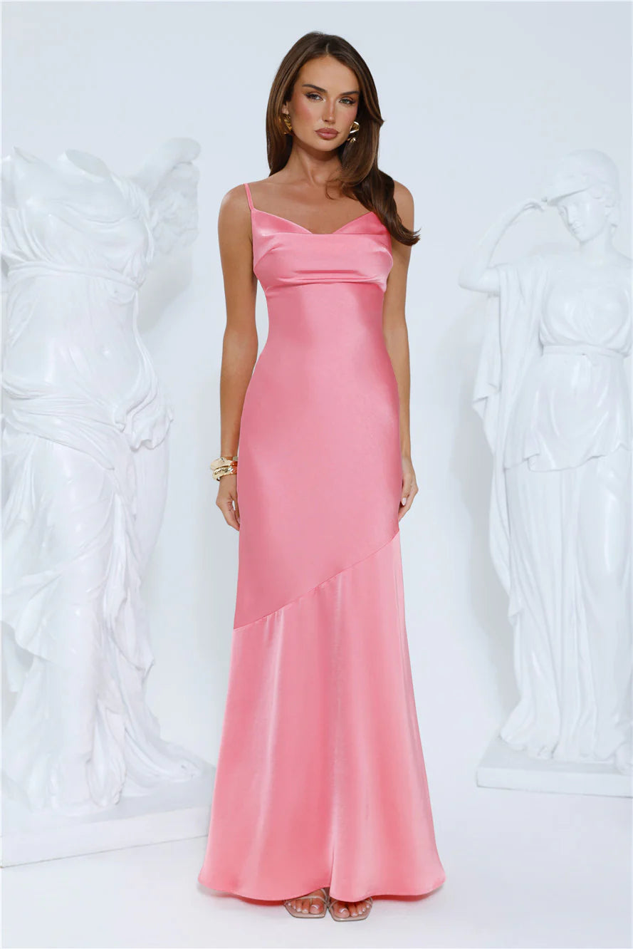 The Brilliant Belle Satin Maxi Dress features a silky satin fabric with a graceful cowl neck and flowy skirt, complemented by an elegant open back. Style it with delicate jewellery and strappy heels for a radiant, sophisticated look.