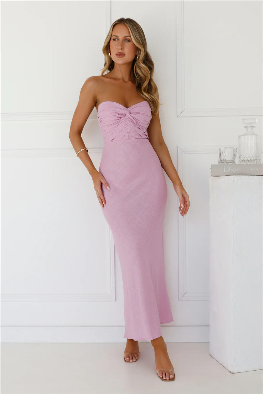 Enter your best-dressed era with the Bubbly Brunch Strapless Linen Blend Maxi Dress. Featuring a gorgeous elastic back, a twist front detail and a pleated top. Style with sandals and curls for a 'fit we love.