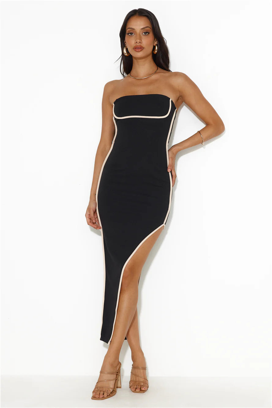 Level up your 'fit with the Casino Queen Midi Dress. Featuring an asymmetrical skirt and nude trimming. Style with heels to have all the attention on you.