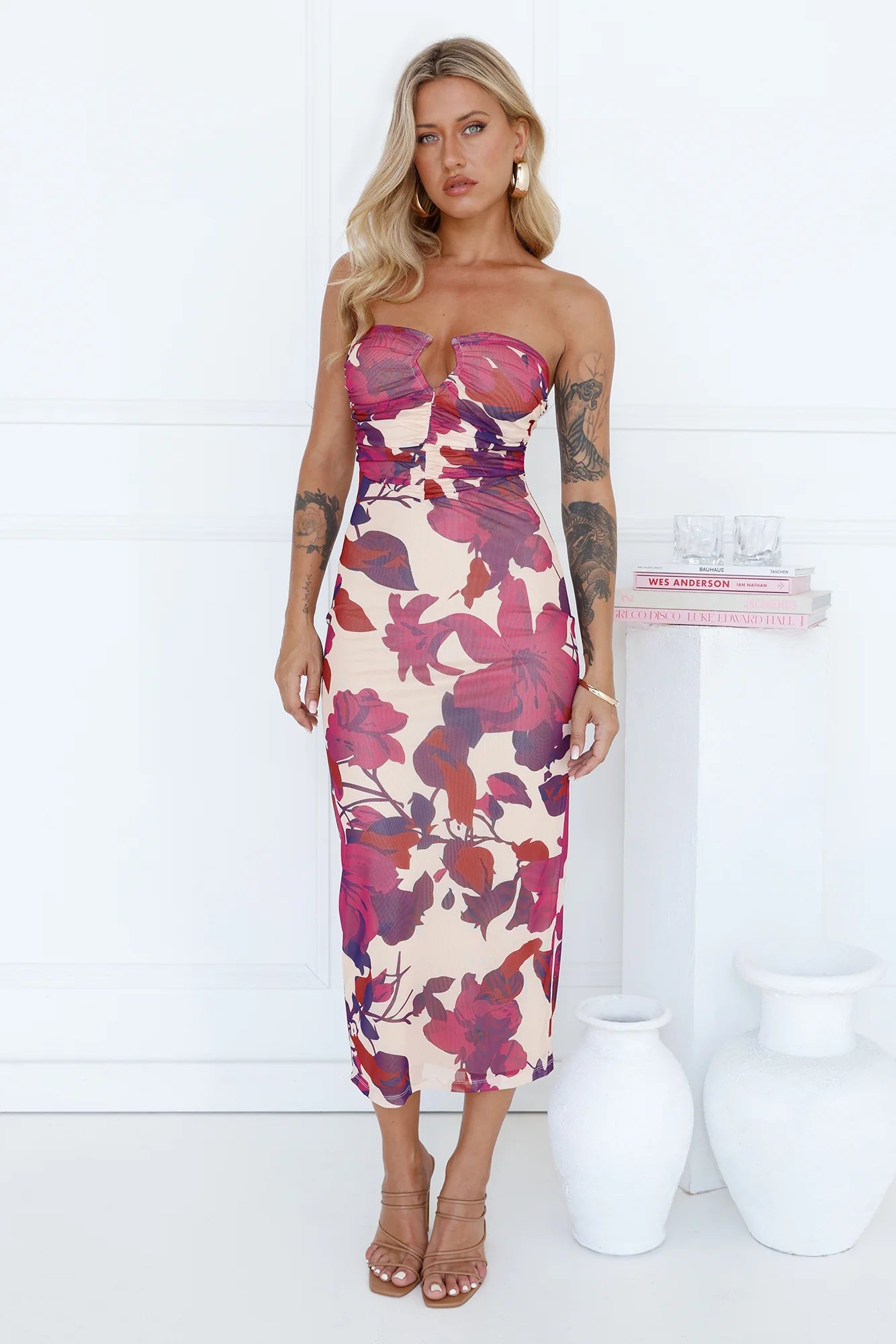 We've got the perfect night 'fit for you, lovely! The Chic Evenings Strapless Mesh Midi Dress features a wire neckline and a straight silhouette. Style with heels for all the attention.
