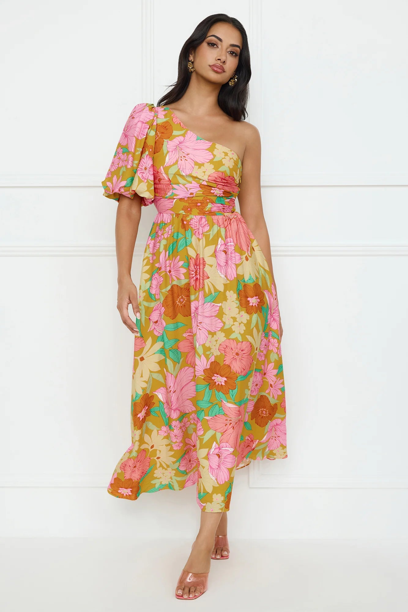 The dreamiest design has arrived, lovely. Be seen in the Coconut Crush One Shoulder Midi Dress for your fancy event. Featuring a one-shoulder design with a puff sleeve, a flowy skirt and a gorgeous print. Style with heels for all the likes.