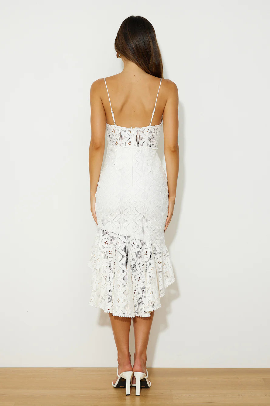 Get your party vibe ready, girl. The Dance Till Sunrise Lace Midi Dress features a frill hem and front split. Style with heels and curls for all the likes.