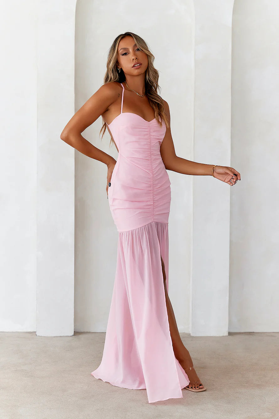 You've found the dress you've been searching for, girl. The DEAR EMILIA Flawless Fit Maxi Dress features an extravagant open back, a gathered detail to the front and back and a sultry front split. Style with heels and curls for all the compliments.