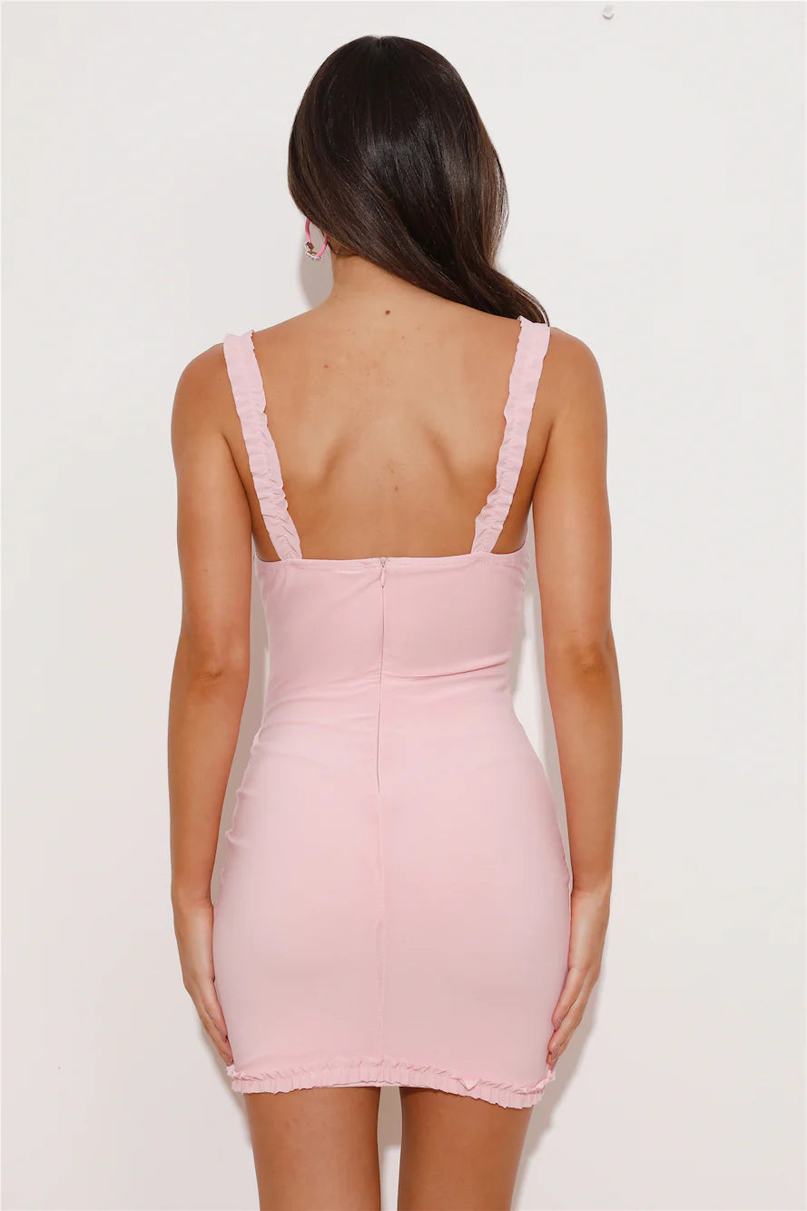 Channel your romantic vibes in the Dessert Served Mini Dress. Featuring a frill trim and drawstring design. Style with heels and curls for all the likes.