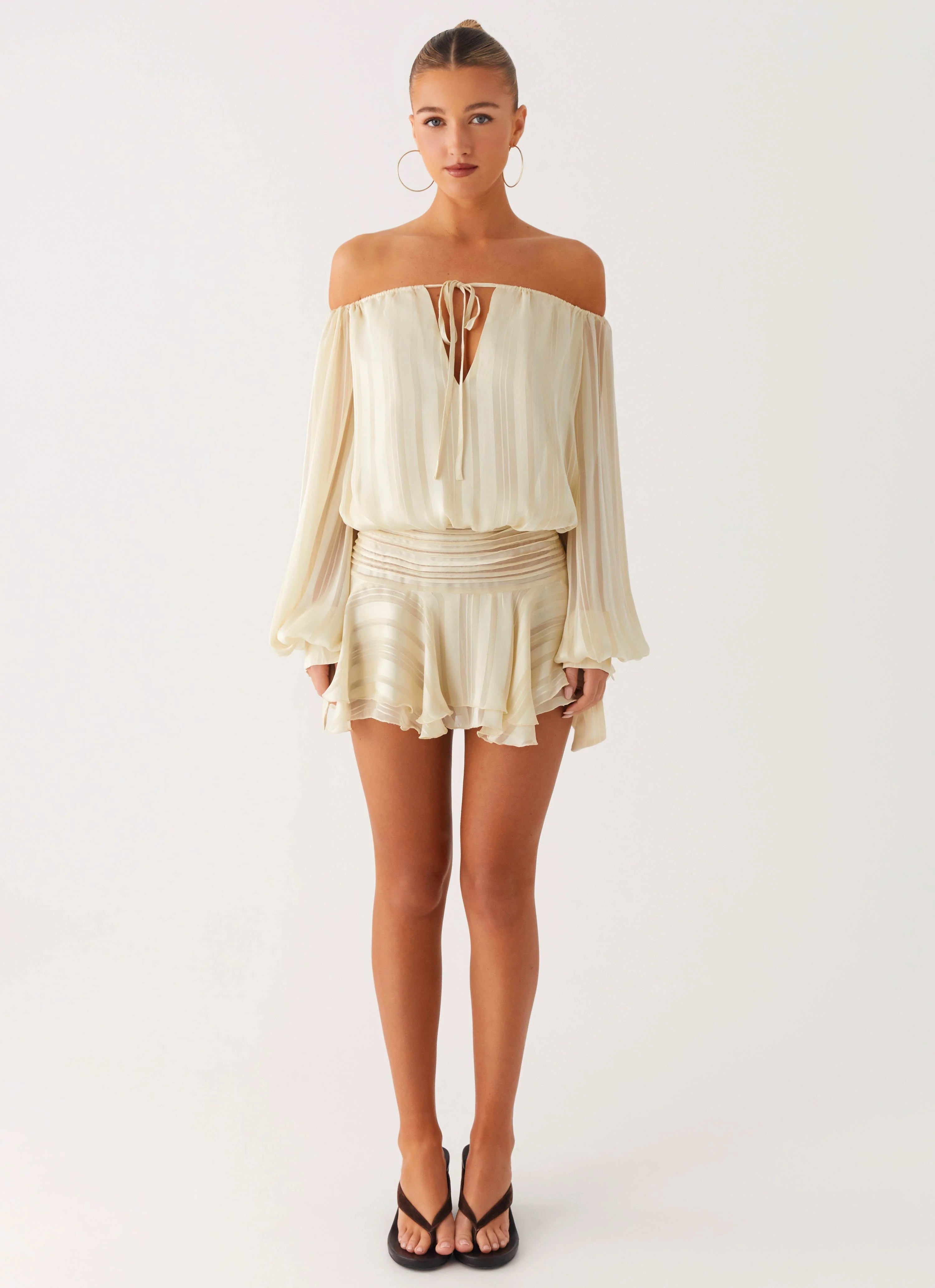 The Eira Balloon Sleeve Mini Dress captures effortless charm with its off-shoulder neckline and elasticated finish for a secure, comfy fit. The frilled hem adds playful movement, while the front tie detail brings a touch of flirty elegance. Perfect for those balmy nights that demand a standout silhouette.