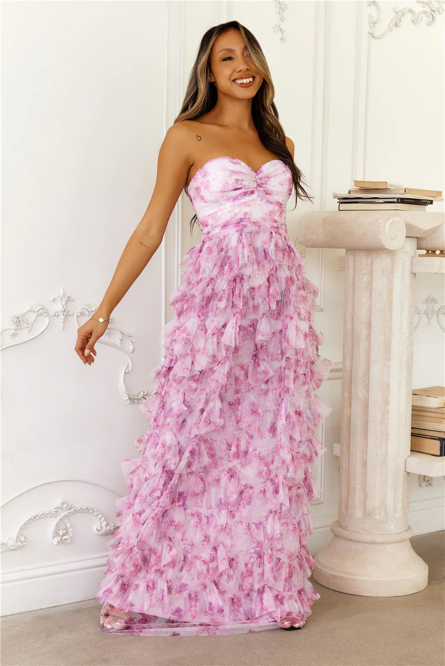 Romanticise every moment in the Festival Of You Strapless Tulle Maxi Dress. Featuring a gorgeous frill skirt, a fitted bodice and a printed design. Style with heels for an unforgettable fit.