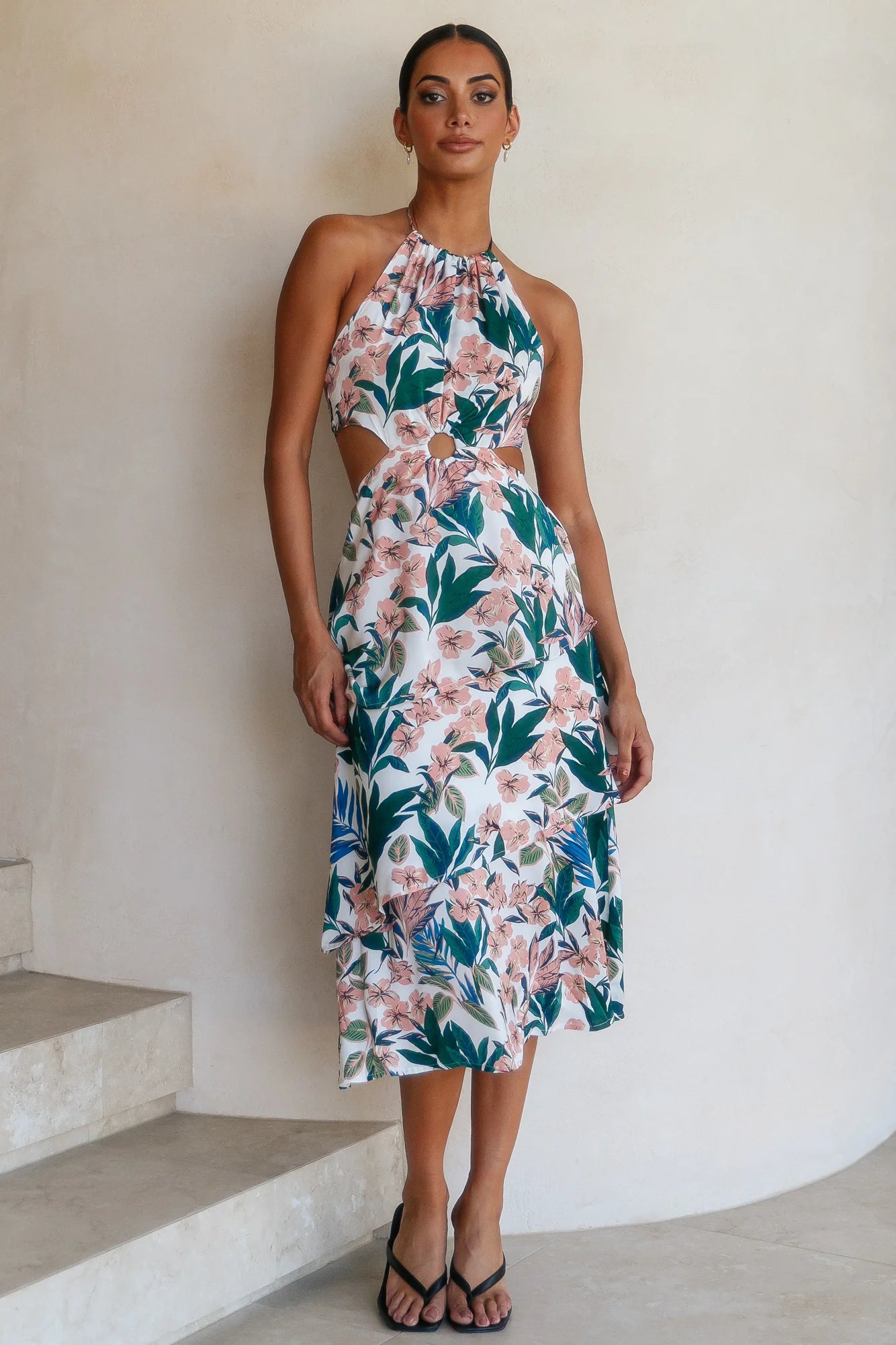 Hear the heavenly hymns as you embrace your Angelic Heart. This maxi features a tie-up halterneck detail with back ties, a ring detail at the front, waist cut-outs and a very ruffled skirt. Style yours with mules and gold jewellery.