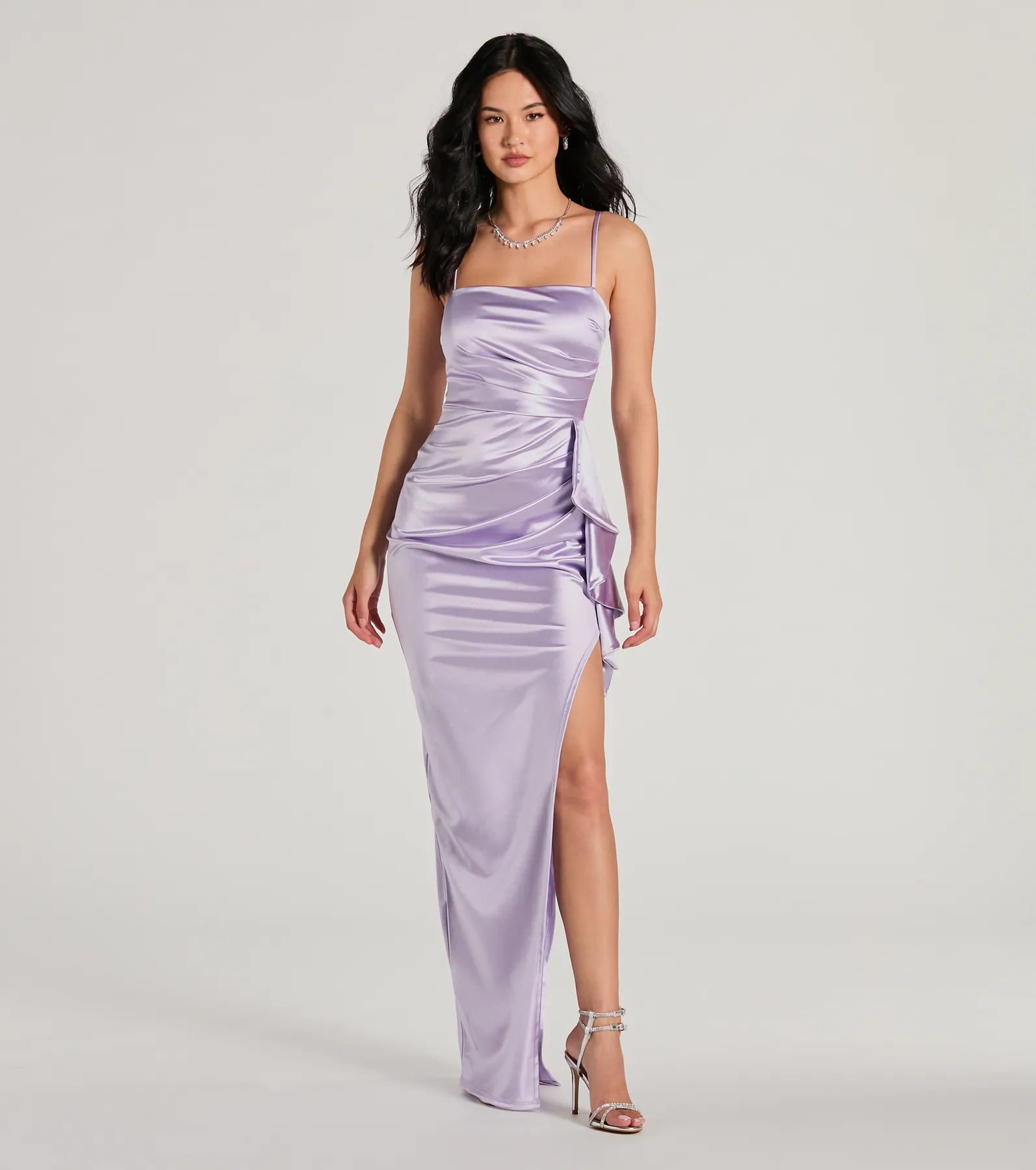 Impress everyone with your impeccable taste in the Melissa satin formal dress perfect for wedding guests, bridesmaids, or attending a fancy soiree! Crafted from luxurious satin, this slim fit dress features a square neckline and delicate spaghetti straps. The ruffled high-side slit adds a touch of drama, while the long-length hem exudes elegance. Complete the look in dressy and a clutch for a glamorous night.