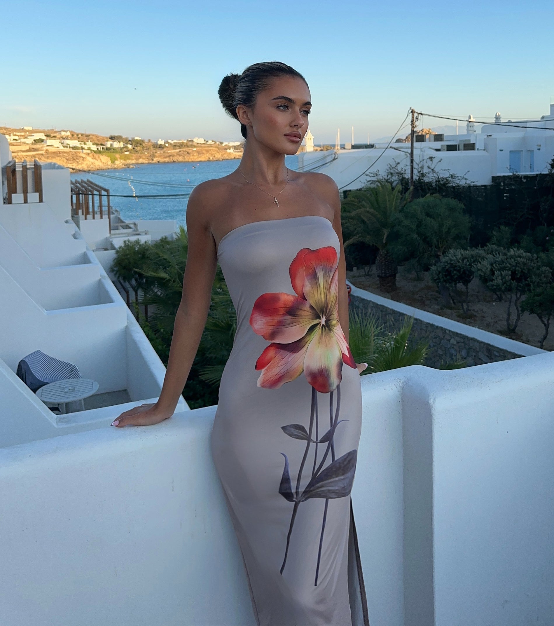 This strapless bodycon maxi dress brings major drama with a bold floral print and side thigh-high slit made to steal the spotlight at a beach brunch or on vacation!