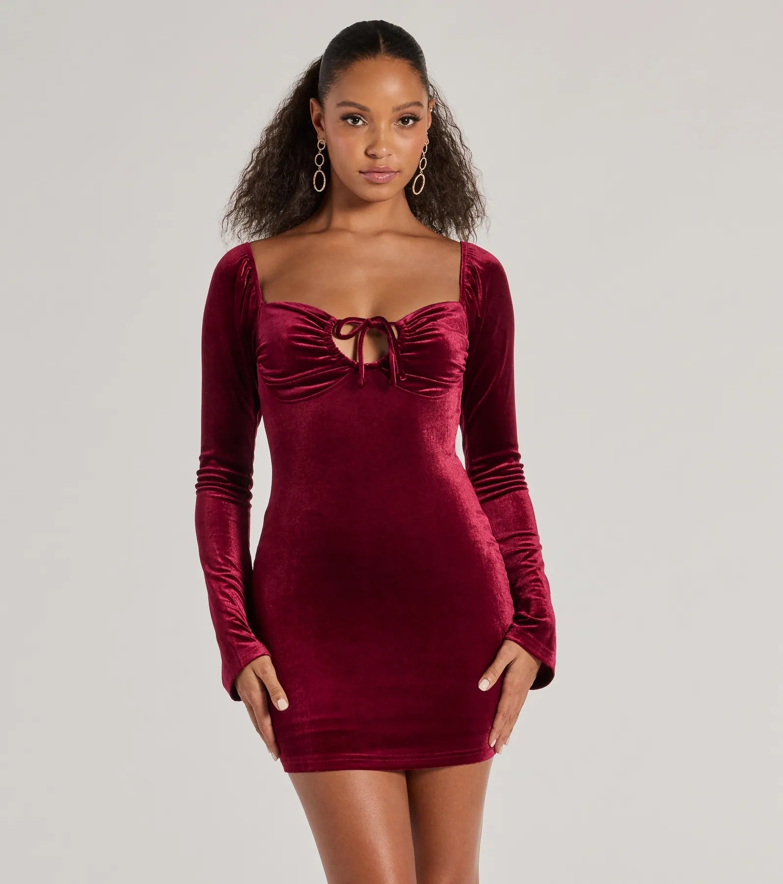 It's the season of splendor with this velvet mini dress in your lineup! It features a trendy sweetheart neckline with a bust tie, flare long sleeves and a sultry bodycon silhouette. Style the dress with earrings.