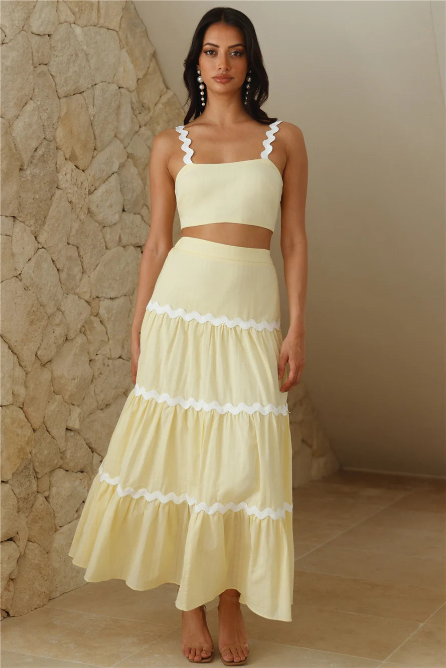 The Sunshine Set is an essential for your new season wardrobe. Featuring an elastic back flowy skirt and a crop top with white fun straps. Style with loose curls and sandals.