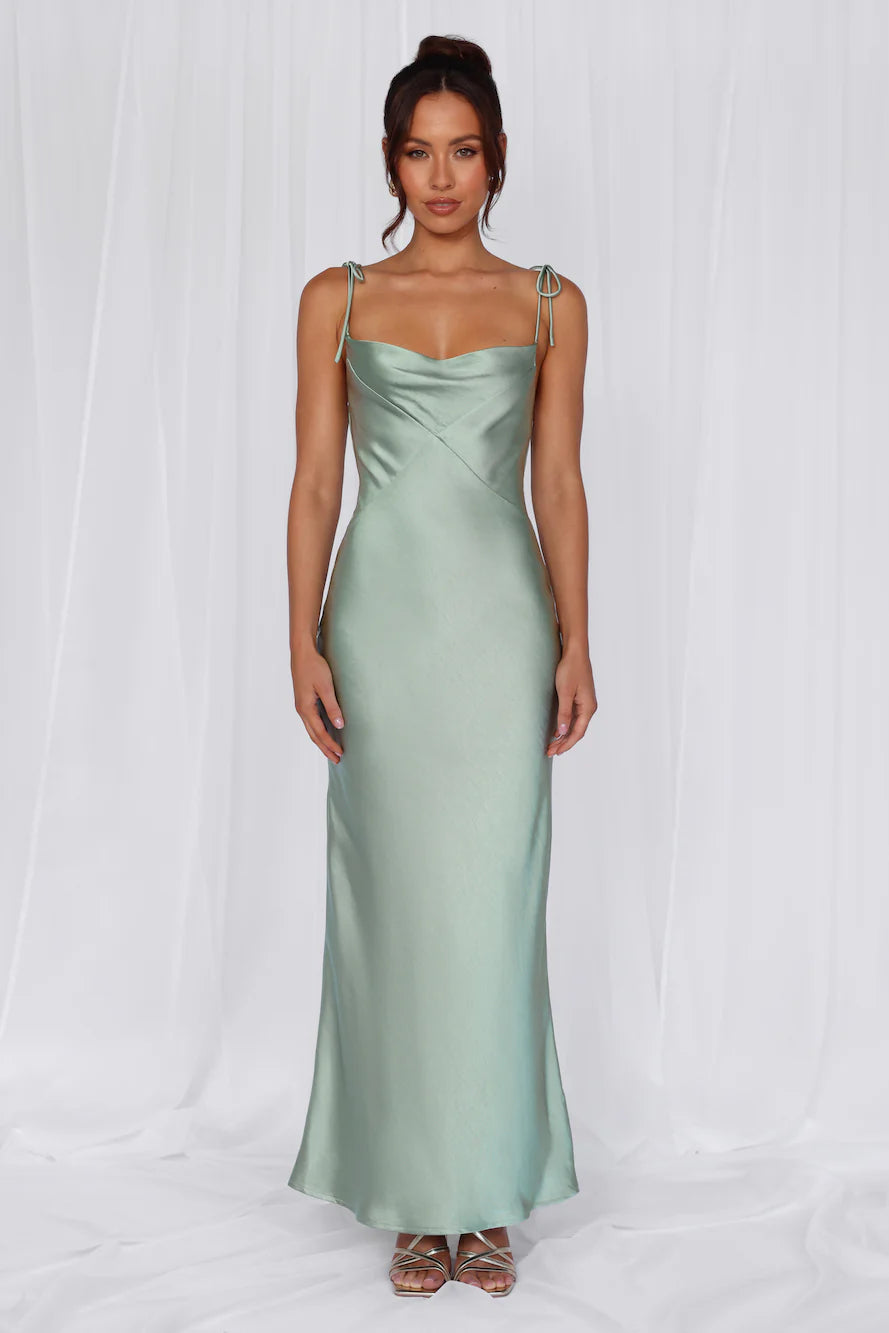 Crafted from luxurious satin, this dress showcases opulence and grace at its best. Featuring a cowl neckline that drapes with effortless allure, adding a touch of refined glamour to the look. Accentuating the shoulders are delicate tie-up straps, a charming detail that lends a hint of whimsy to the classic design.