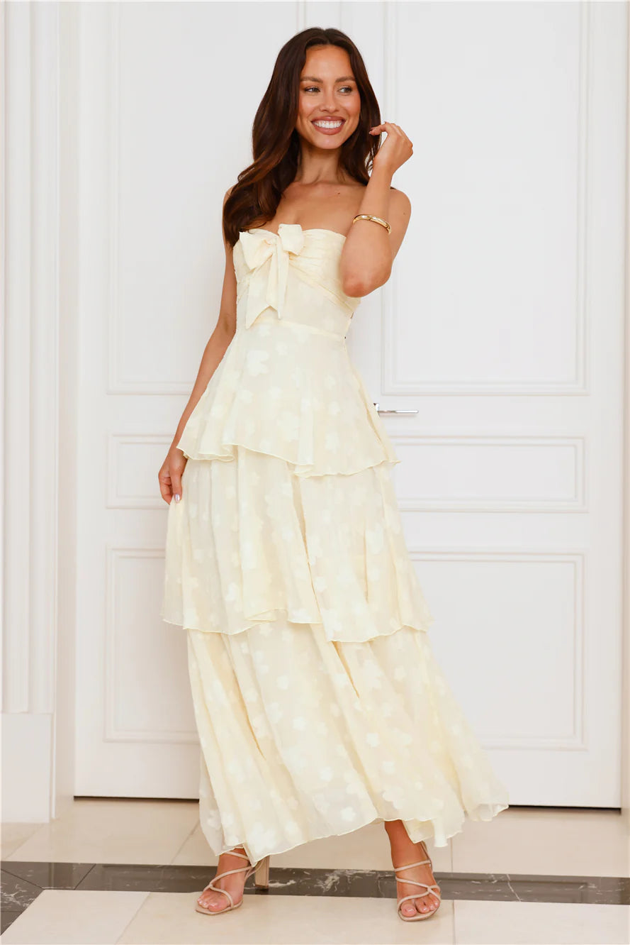 Embrace your flirty, fun style in the dreamy Tranquil Twilight Strapless Maxi Dress. Featuring an elastic back, a tie-up top and a gorgeous tiered frill skirt. Style with heels and curls for a 'fit you'll want pics' in!