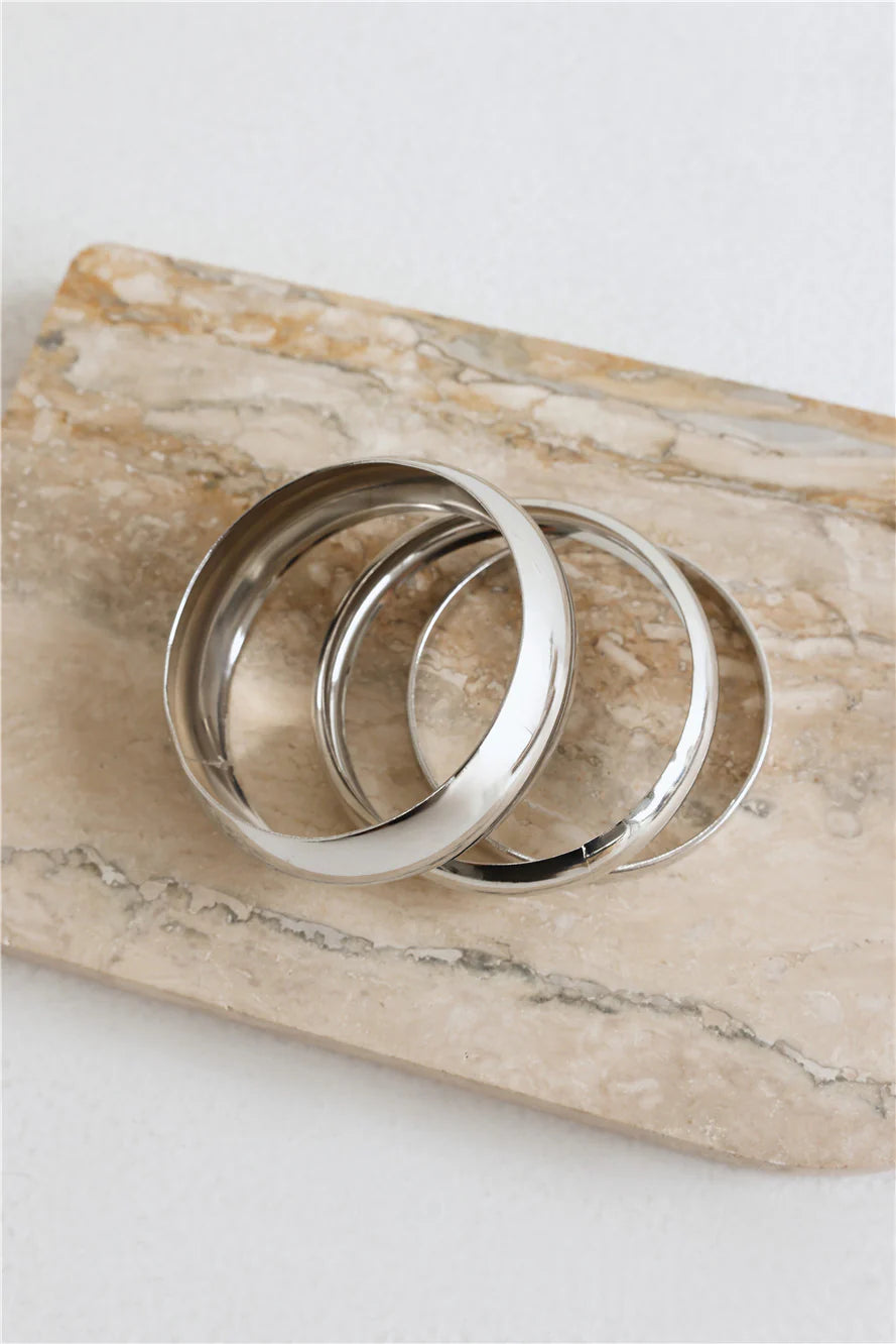 Elevate your accessory game with the Trendy Style Bangles 3pk. This three-piece set features slip-on bangles in a sleek silver shade, perfect for layering or wearing individually for a minimalist statement.