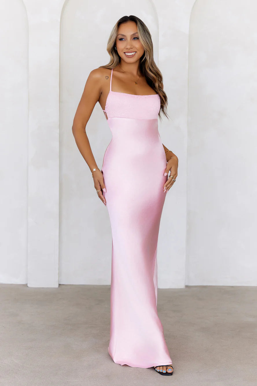 Effortlessly chic in the HELLO MOLLY Welcome Fashionista Satin Maxi Dress. Featuring a gorgeous lace top and a crisscross back detail with a tie design. Embrace timeless elegance when you style it with heels and sparkly accessories.